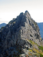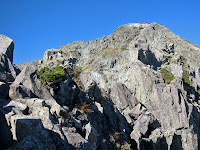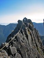 2日目はとてもいい天気でした。たしか涸沢を5時頃出発したのですが、ゴジラの背を登っているときは、私たちのほかには2パーティしかいませんでした。その後北穂の山頂近くを歩いていたとき、後ろから他にも登ってくる人たちがいるのが見えました。