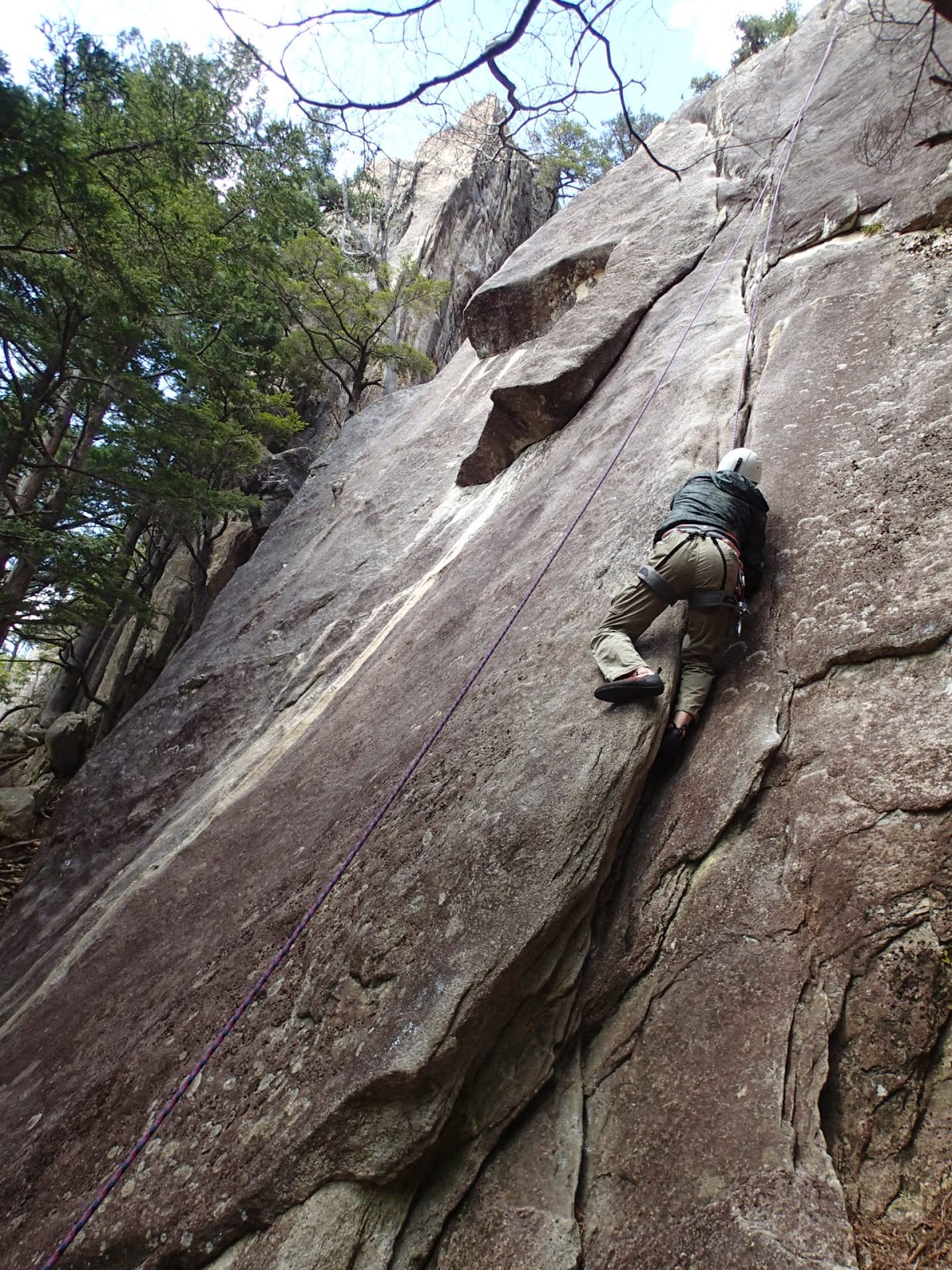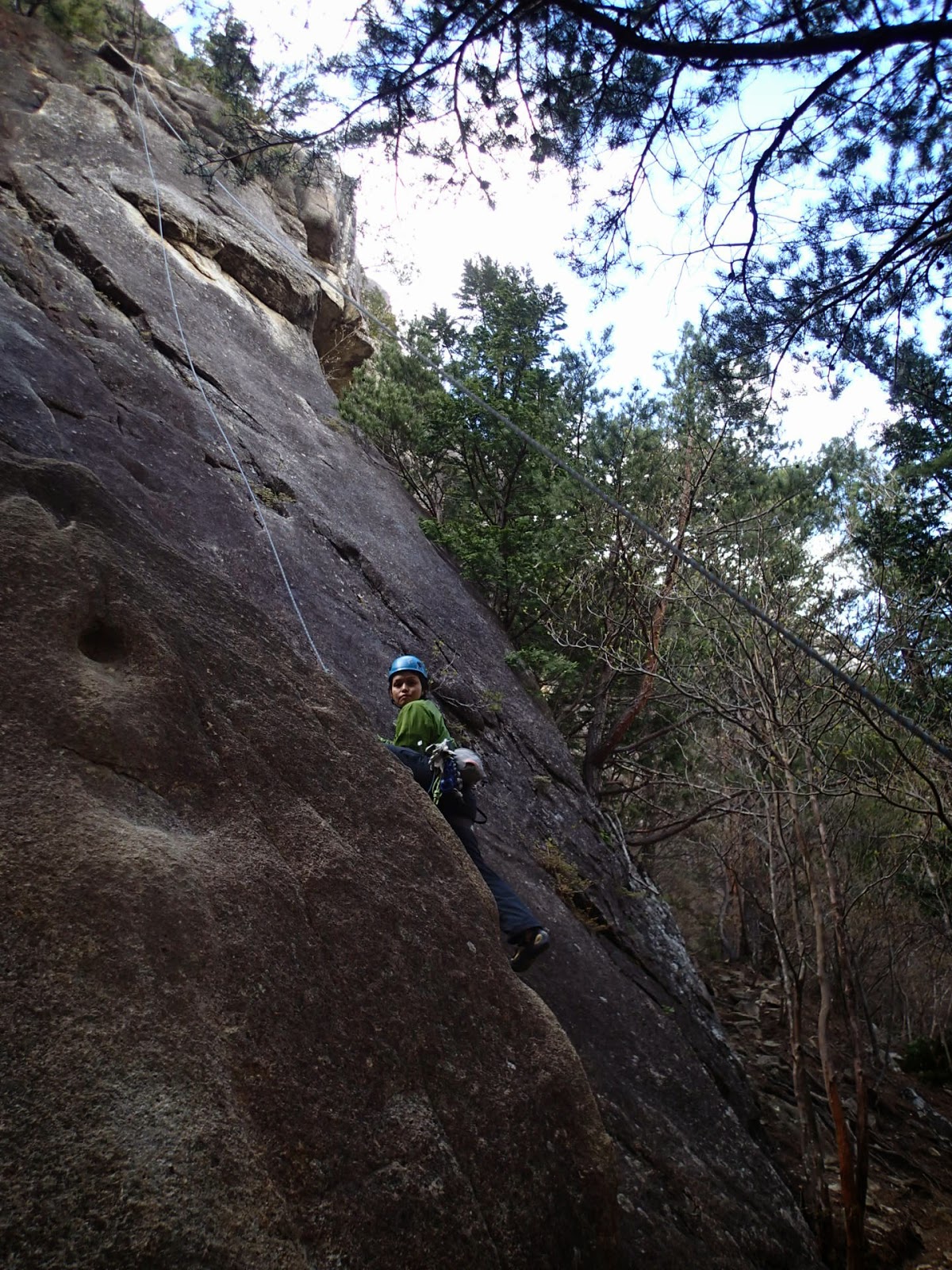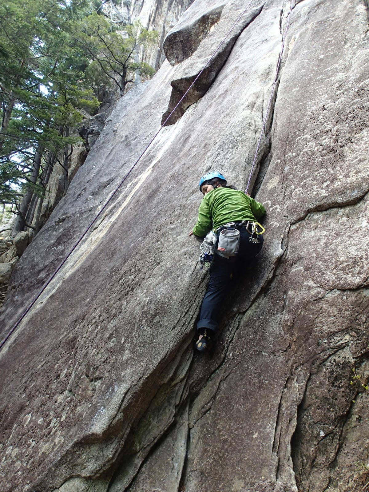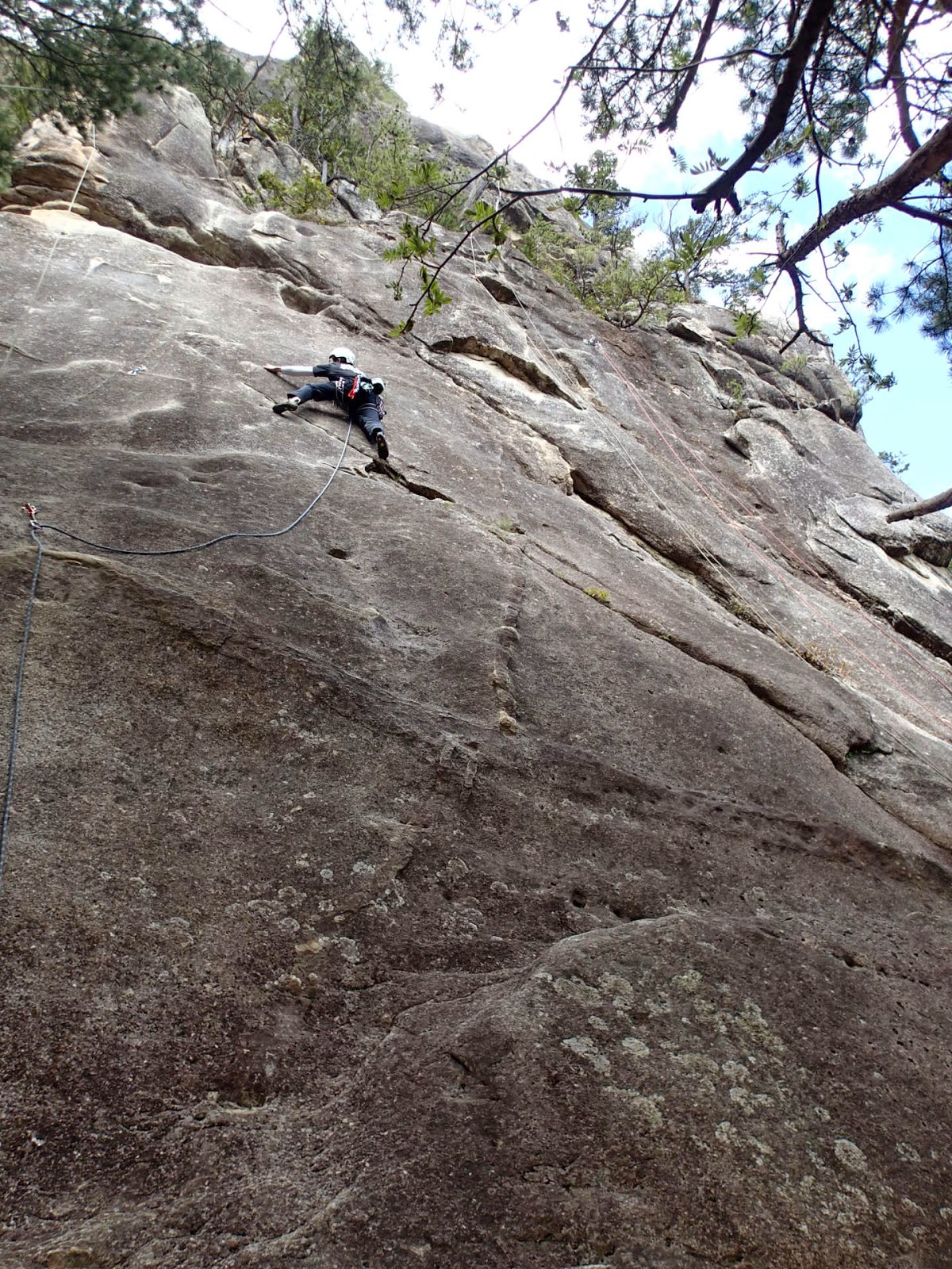 新人Nさんにとっては初めてのマルチルート、前日は緊張で眠れず、当日は不安でいっぱいだったそうですが、小川山についたとたん血が騒いでしまったとの事です。ベテランの2人にロープワークを指導されながら、スラブ、クラック、チムニーとバリエーションにとんだルート。カムやナッツも使用。所要時間6時間の全9P(?)、昼食を食べるのも忘れるほど楽しく、マルチの達成感を得られたようです。