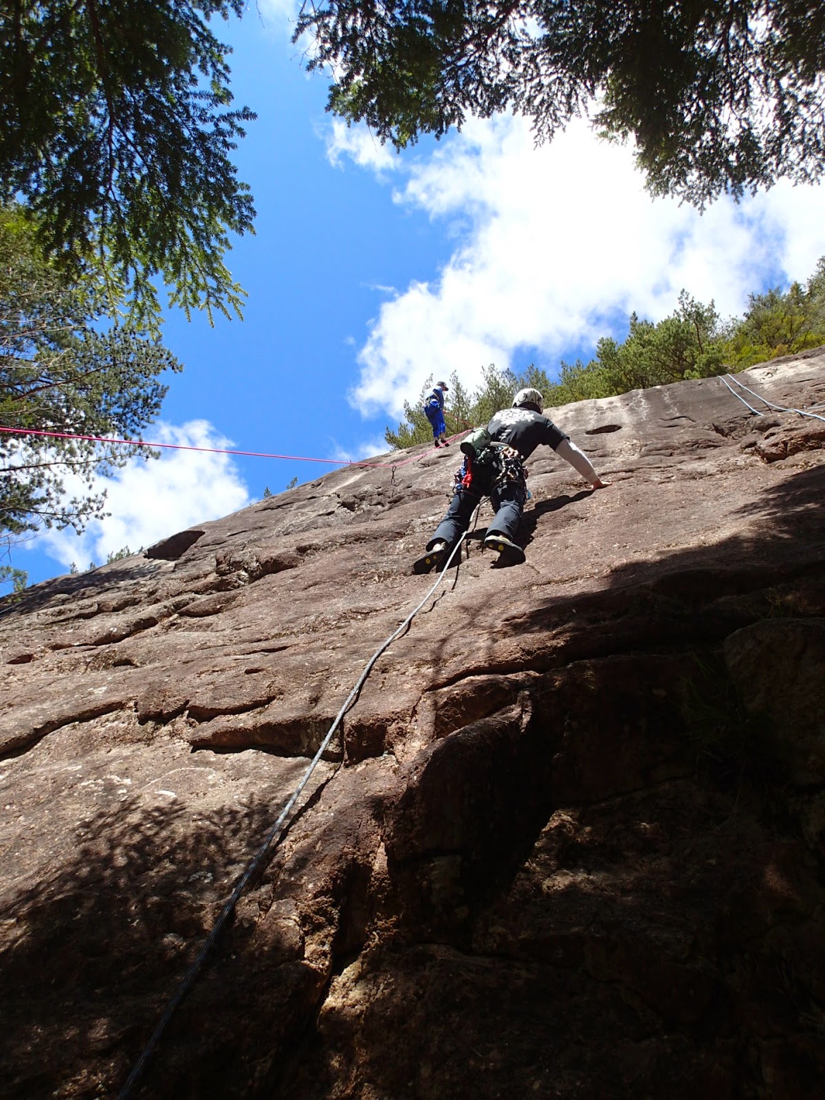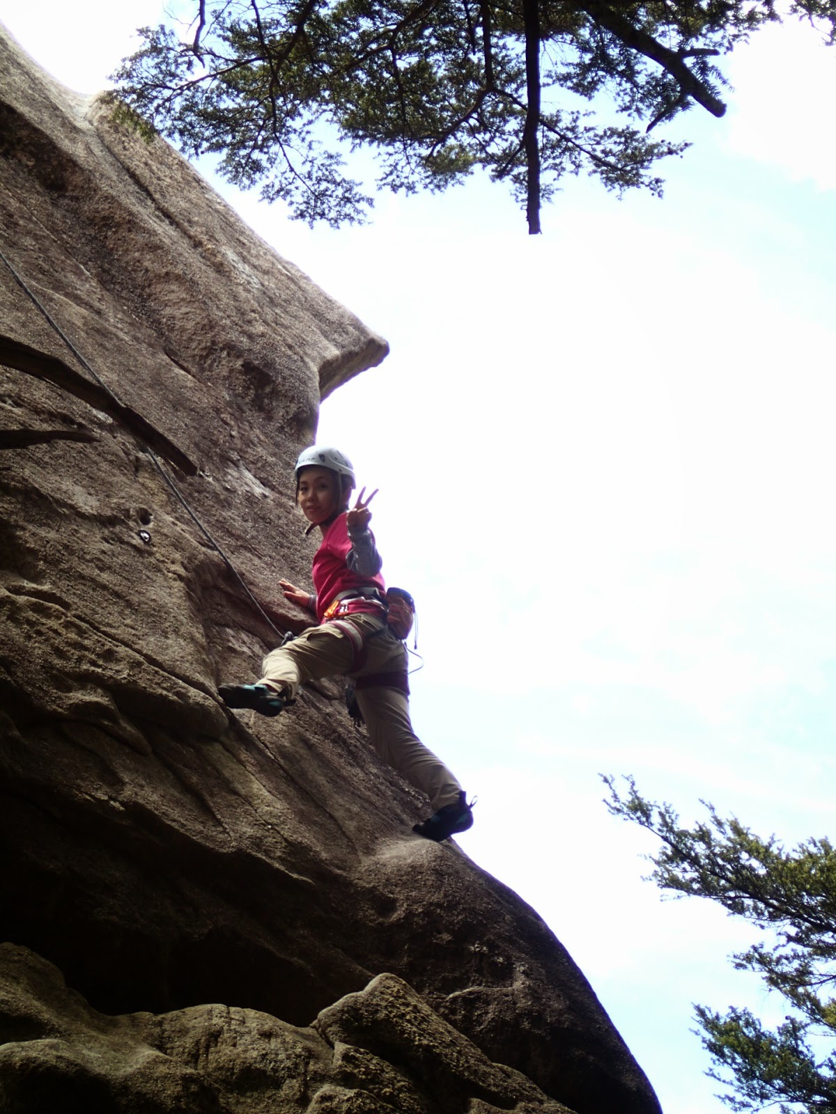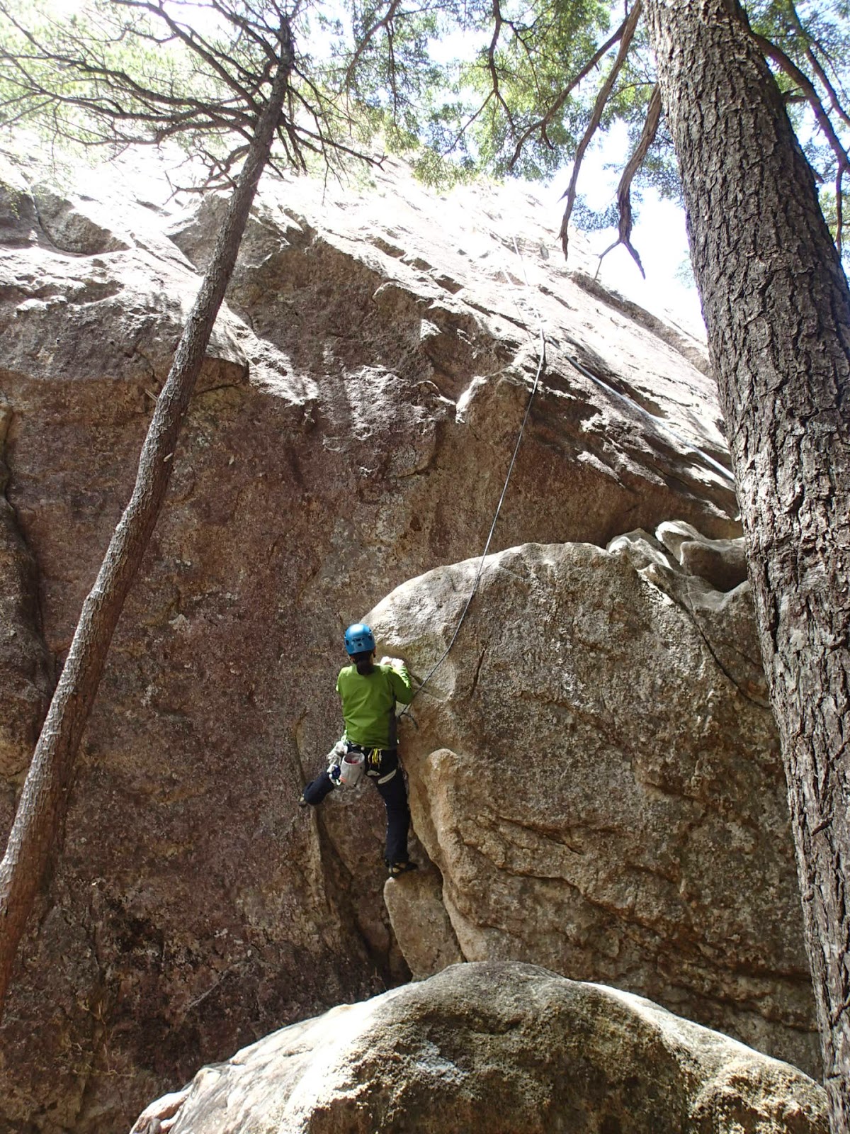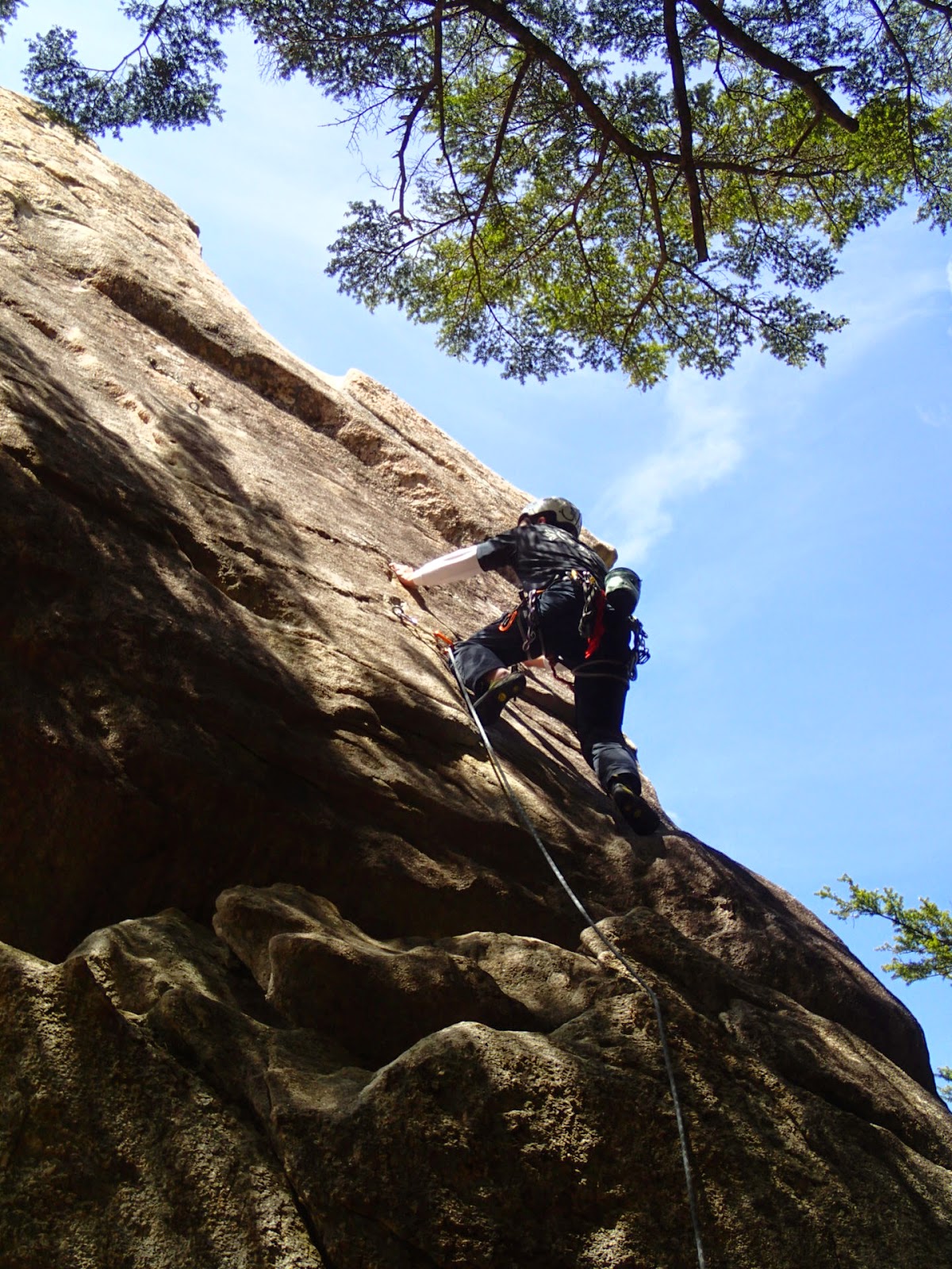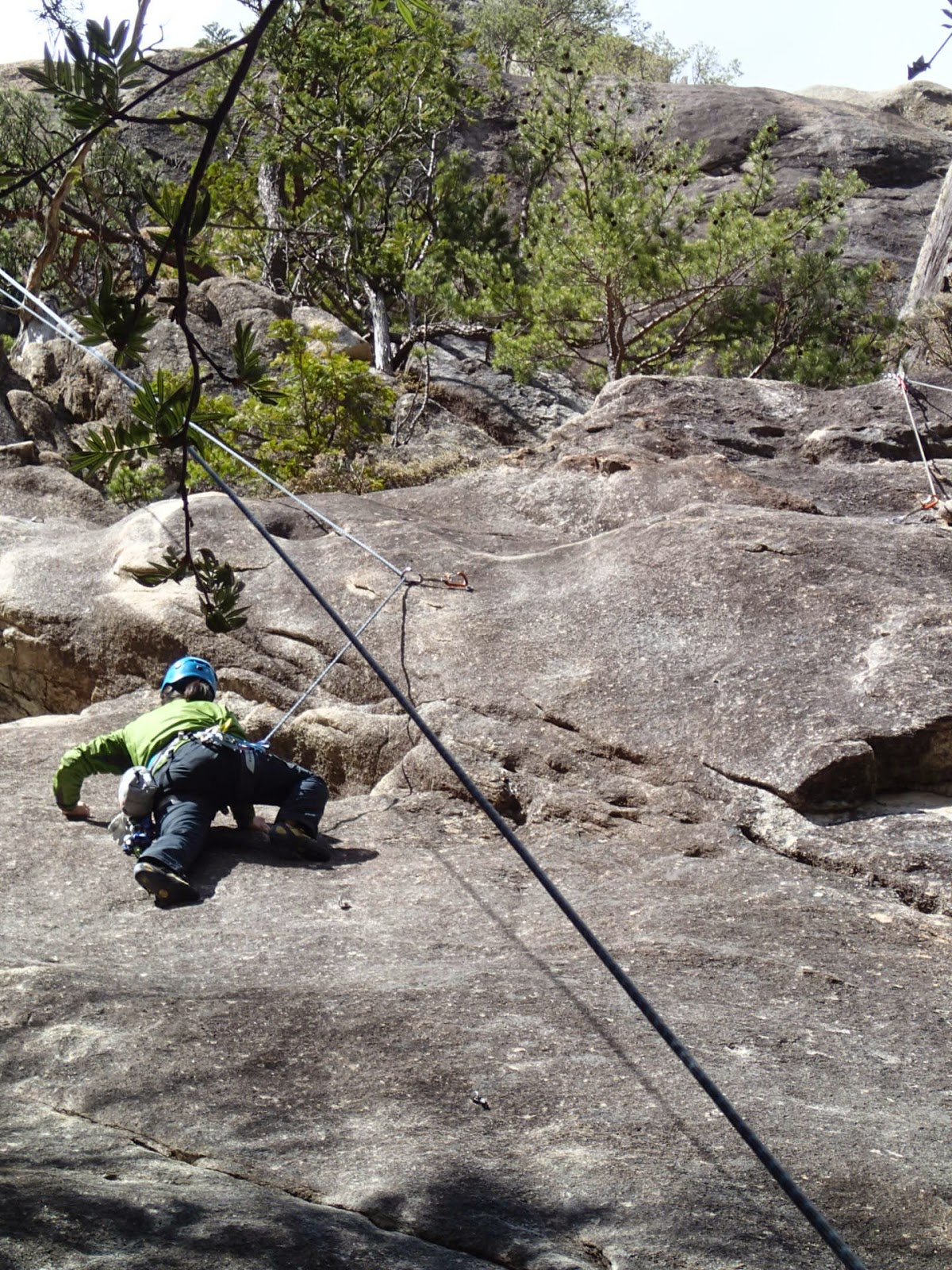 新人Nさんにとっては初めてのマルチルート、前日は緊張で眠れず、当日は不安でいっぱいだったそうですが、小川山についたとたん血が騒いでしまったとの事です。ベテランの2人にロープワークを指導されながら、スラブ、クラック、チムニーとバリエーションにとんだルート。カムやナッツも使用。所要時間6時間の全9P(?)、昼食を食べるのも忘れるほど楽しく、マルチの達成感を得られたようです。